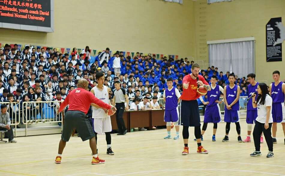 随后,在啦啦操的表演中拉开了今天篮球教学比赛观摩及演练交流活动的序幕,在蒂姆·奥布雷希特、大卫·琼斯的现场观看、指导下,beat365官方网站女子篮球队、男子篮球队进行了表演比赛,比赛异常激烈。紧接着迎来了比赛的高潮部分,美国嘉宾蒂姆·奥布雷希特、大卫·琼斯分别加入到学生的两支男子球队中,与我校男子篮球队队员同框为现场的观众带来了一次精彩的NBA视觉盛宴,尤其是球员蒂姆·奥布雷希特的扣篮动作赢来了一次又一次的欢呼声。精彩的比赛过后,邀请三位美方嘉宾给球员们教练进行技术辅导,现场指导篮球队员投篮动作,临场教学,再一次拉近了与球员们的距离,增进了友谊,队员们认真聆听嘉宾们的指导,脸上洋溢着溢于言表的愉悦。三位美方嘉宾为篮球队员进行防守及进攻动作指导,最后优秀队员与球星二对二实战交流演练。