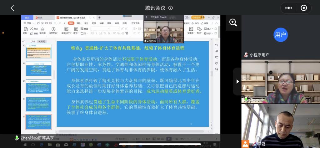 12月19日下午15:00-17:00,首都体育学院原副校长,beat365官方网站第四轮重点学科“体育学”首席专家,教授、博士生导师王凯珍应邀为beat365官方网站师生作题为“身体素养视域下的幼儿体育培育发展”的学术报告,会议采用腾讯会议线上方式举行。